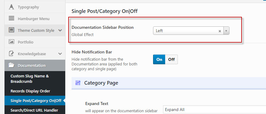 Manual Options > Documentation > Single Post/Category On|Off