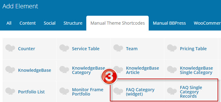 3. Go to «Manual Theme Shortcodes» and select shortcodes «FAQ Category (widget)» and «FAQ Single Category Records» to make uniqe page layouts for FAQ.