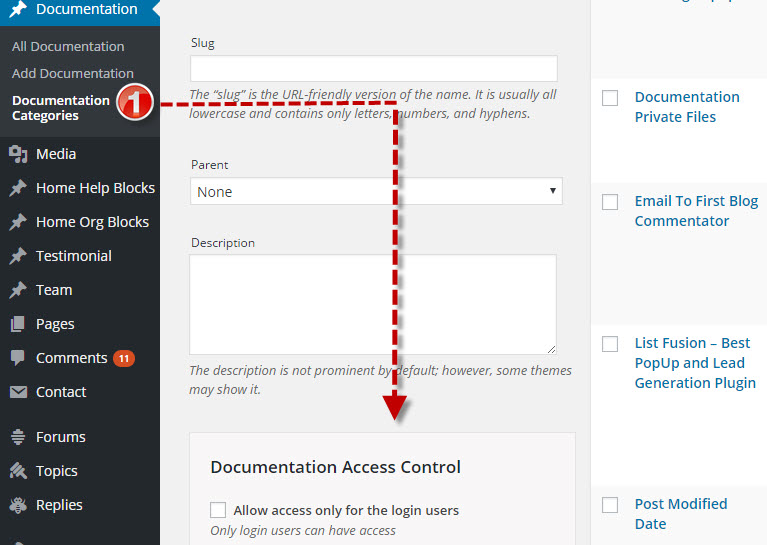 - You will see section “Documentation Access Control”, apply necessary settings so that you can display content for only logged-in users or define user role so that ONLY specific users can have category post access.