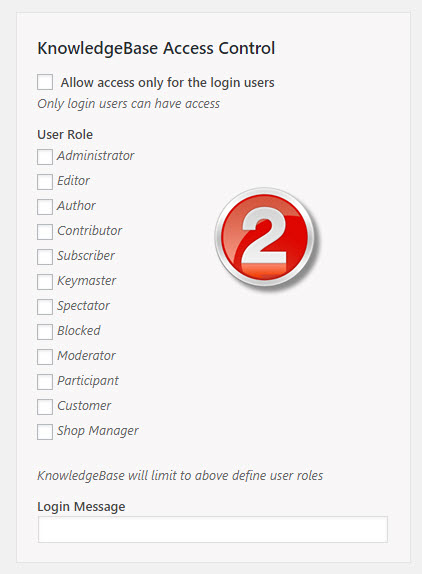 2. You will see section «KnowledgeBase Access Control», apply necessary settings so that you can display content for only logged-in users or define user role so that ONLY specific users can have category post access.