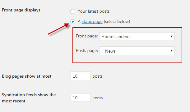 Select Front page as «A static page» and select Front page as «Home Landing» & Post page as «News»