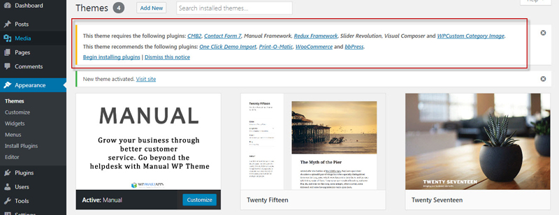 Once you have installed and activated manual you will be prompted to install recommended plugins. Just click the link to begin installing plugins.