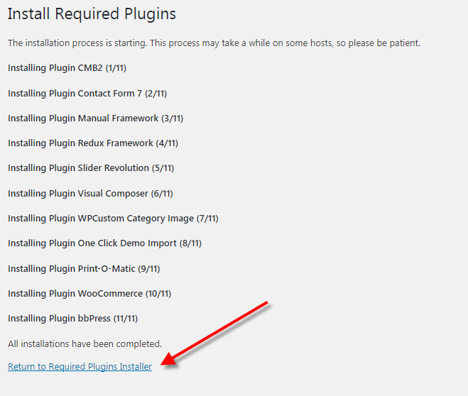Installation can take a couple minutes depending on your host. You should see a success confirmation for each plugin as it is installed. After you have installed all the plugins, return to the plugin installer.