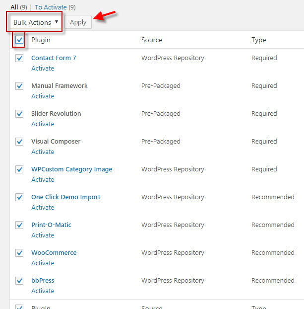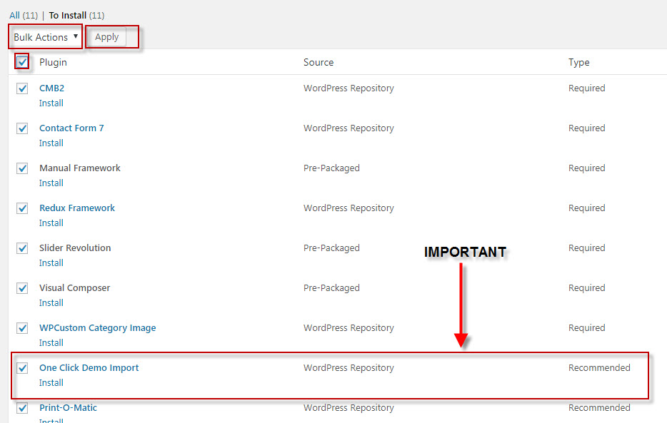 Next, check boxes to select all the plugins you want to install, select the bulk action of install from the drop-down box and then click the button to apply.