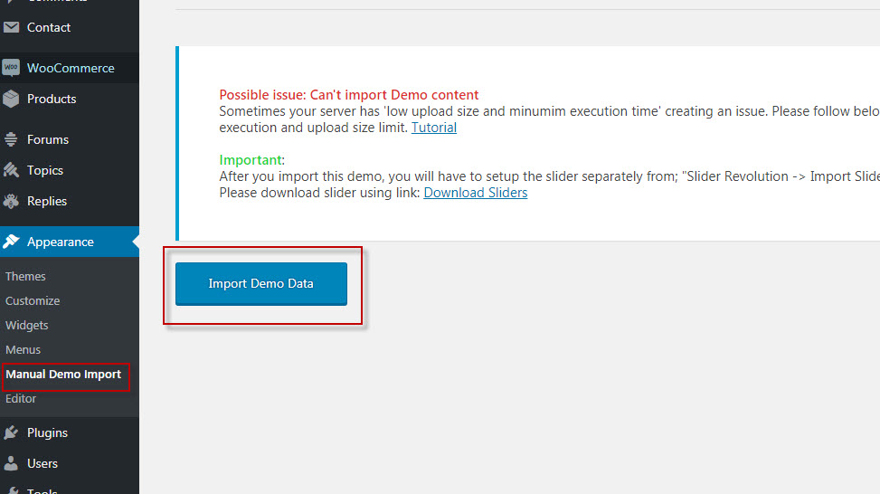 Go to Appearance -> Manual Demo Import and click on Import Demo Data.
