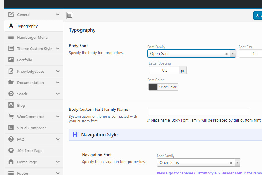- Please go to «Manual Options > Typography» to change google font family available from the drop down list, if you have any custom font that not on the drop down list, you can simply add font name on the «Custom Font Family Name» section to have your own font.